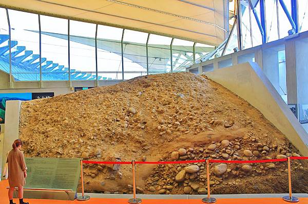 這是車龍埔斷層的地底剖面。車龍埔斷層造成岩層突然錯動,在地表拉出長達100公里的斷層破裂,從南投竹山一路往北延伸到苗栗卓蘭的內灣,這個剖面事取其一小段。剖面中央有一S型砂層,厚度約34公分。這個S型砂層的彎曲處就是車龍埔斷層的位置,斷層把右邊的砂層往上推擠,造成砂層右高左低,上下垂直錯動了1.62公尺。然而,園區的操場跑到則是拉抬了2公尺,而石岡壩附近更是拉抬了9.8公尺,相當令人震撼!