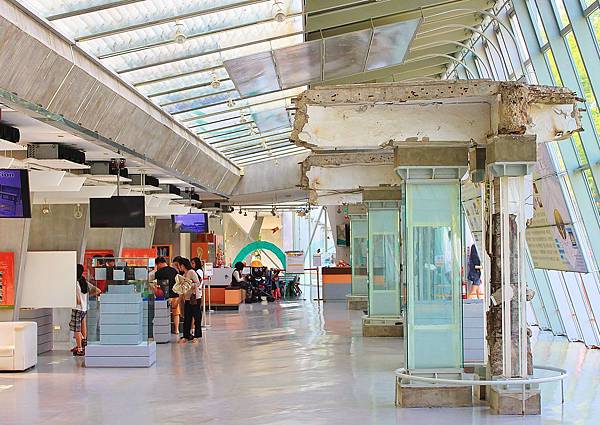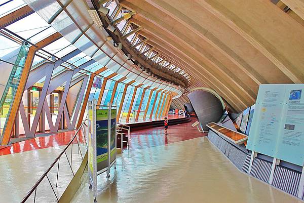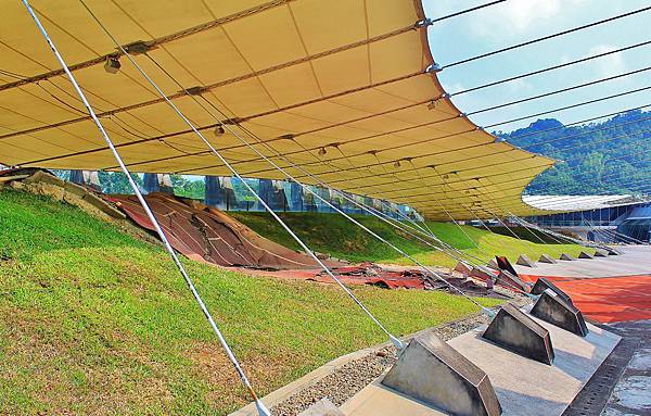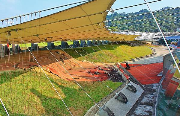 車籠埔斷層保存館即是以斷層與既有跑道結合而成,館內一景,左邊落地窗外就是操場跑道。