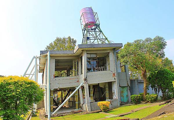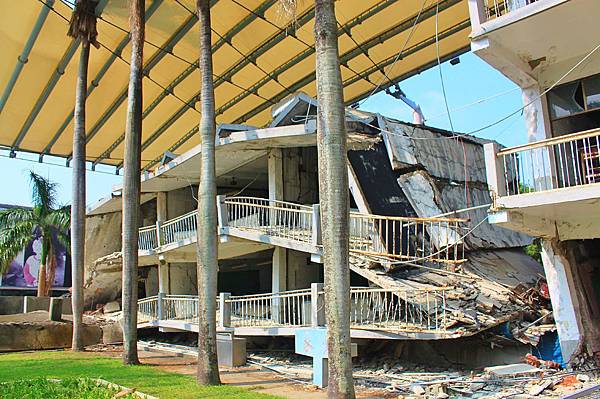 地震工程教育館旁損毀的教室,內部和教室外都已有用強化的樑柱加以固定。