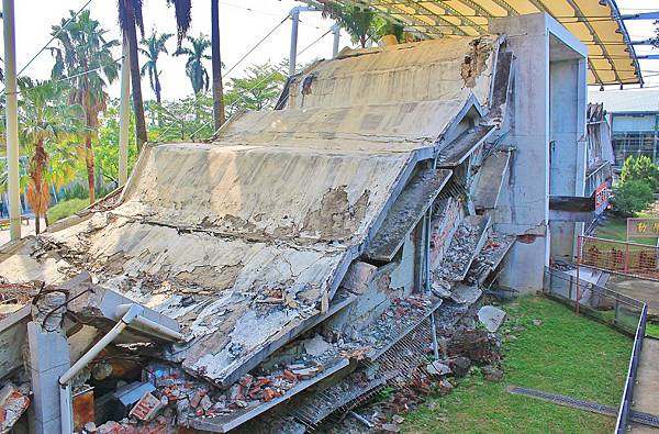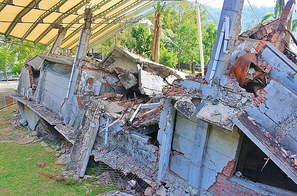 光復國中北側教室,車籠埔斷層剛好切過建築物,造成北側教室幾乎是完全損毀與倒塌,相當怵目驚心。