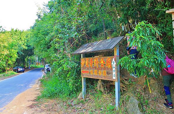 旗尾山共有三個登山口,除了第三登山口的路線為水泥路、石階梯步道外,第一和第二登山口除了行走一般山逕外,還必須沿著山稜線攀爬,好不刺激!這次計畫從第一登山口起登,從第三登山口下山,再沿著竹寮路走回原點。第一登山口位在"妙蓮寺濟公廟"指標的後頭,不是一旁的石磚步道喔!