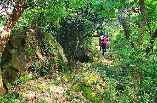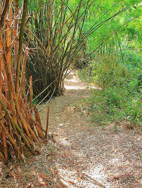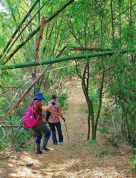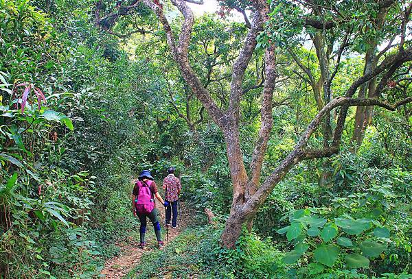 很快的就會接到山稜線上,林相也慢慢轉變為竹林。全程樹蔭茂密,不用擔心陽光直接曝曬造成晒傷,但是蚊蟲很多,在登革熱流行季節務必要塗抹防蚊液。