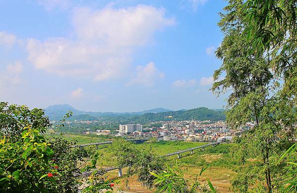 竹林間的縫隙,遠眺旗山市區。正前方是楠梓仙溪,最近端的橋樑是給腳特車、行人專用,中間是旗山橋,遠端則是新旗尾橋。