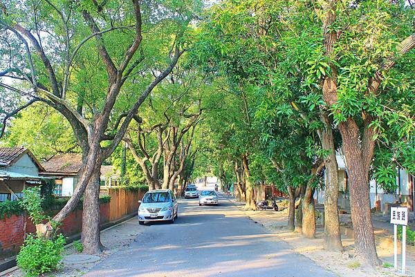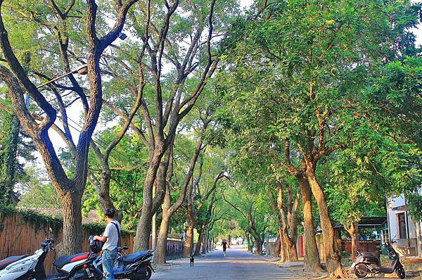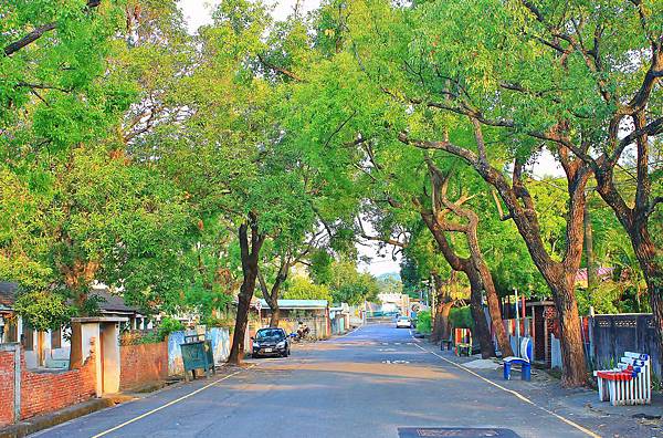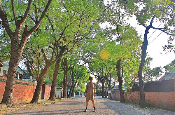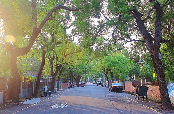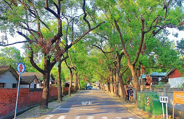 民權路一景,道路兩旁都重有路樹,每戶人家都是由紅磚牆圍繞。