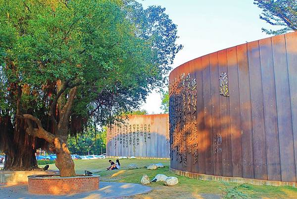 賴何詩牆,牆面是由100片垂立鋼板組列而成的鋼構體,如冊頁造型之地標物。從其手稿中挑字重排,以尊崇原書寫筆跡。另原字型筆劃較細,故描粗字體,以利堅固切割字型。其空間位置上有如彰化之門楣。以〝文化的體現〞與〝歷史的精神價值〞為主軸,營造出〝莊嚴樸實〞的〝彰化文學〞空間視覺。