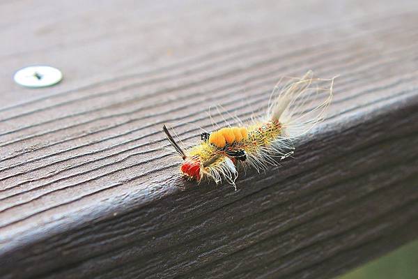 有答案了!感謝candy姐的解答,這是小白紋毒蛾的幼蟲~根據資料,圖中算是蛻皮成終齡幼蟲的階段,可見頭部呈紅色,體背上有4團黃色毛叢。如接觸到皮膚會發癢難耐,在野外發現該幼蟲務必要小心。