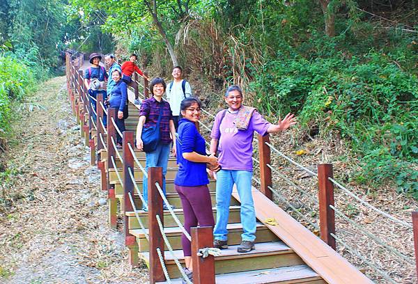 老媽不服老,還是衝第一個!現在剛好是毛毛蟲生長的時節,這個階梯步道的扶手上佈滿為數眾多的毛毛蟲,當心誤觸摸到!
