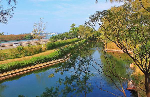 攝於大砲砲門殘跡,城外的護城河,或稱護城濠。護城濠於進出口引橋處較寬,為22公尺,四的頂角稜堡處較窄,為13.3公尺。護城濠是引海水入濠,平時為2.3公尺,漲潮時可達3公尺。現在位於西側的護城濠與安億路比鄰,遠方可見安平漁港及安平燈塔。
