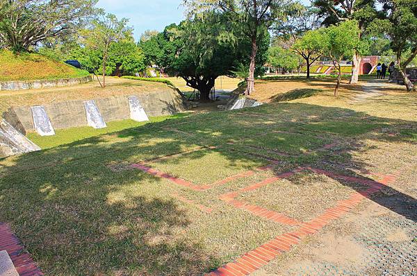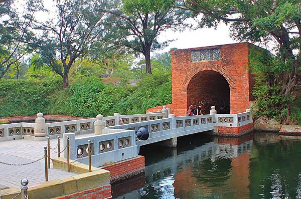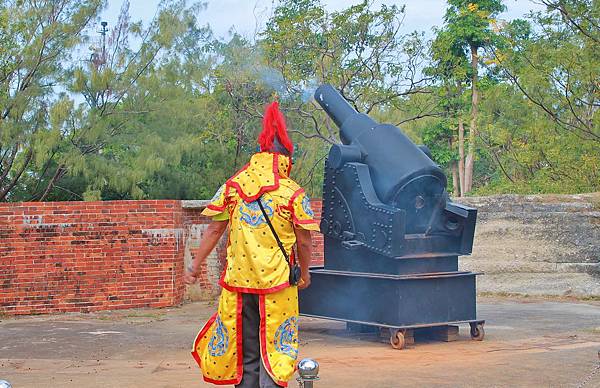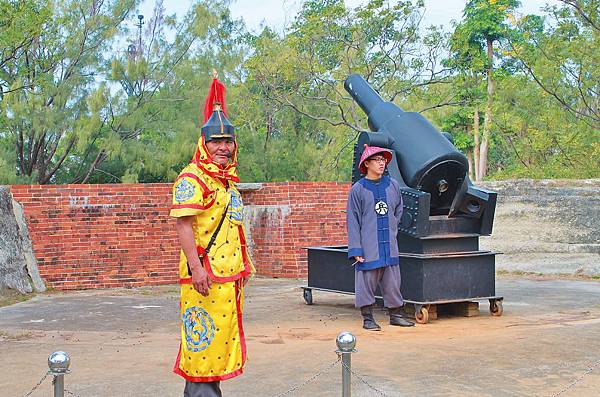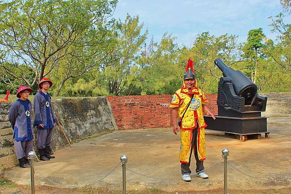 位於西北稜堡處的砲門遺跡,現在定時有園區人員前來表演。好幾年前友來訪億載金城,印象中就是這個老杯杯扮演將軍,想不到多年後還可以遇到他!將軍身旁帶了兩位小兵~