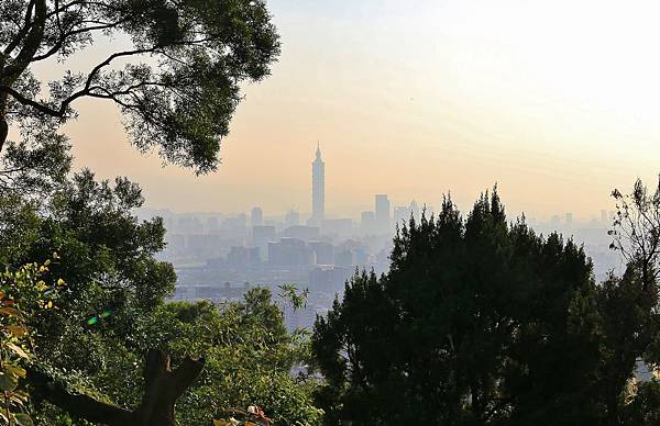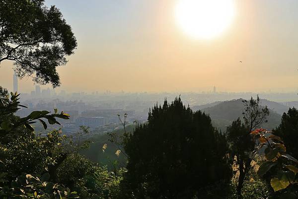 山腳下應該就是國防醫學大學,除了左手邊的101大樓外,右手邊較矮的則是新光站前大樓。拍攝時剛好有架飛機經過,在太陽的右下方處!