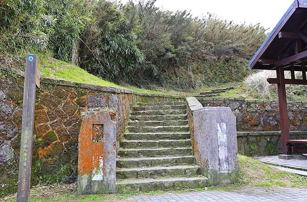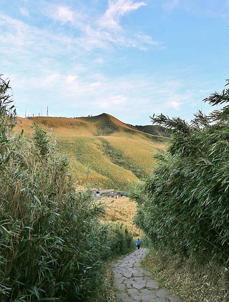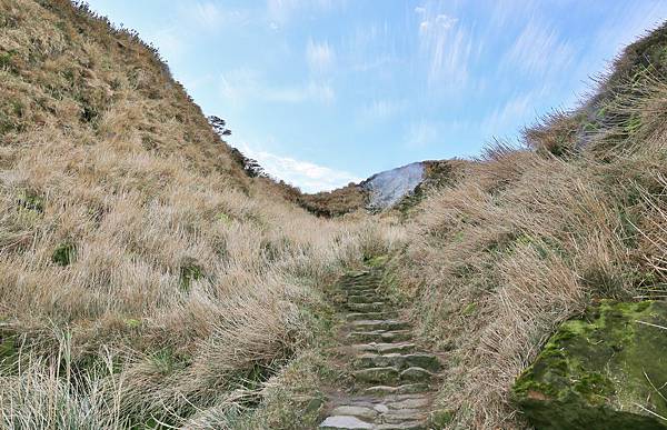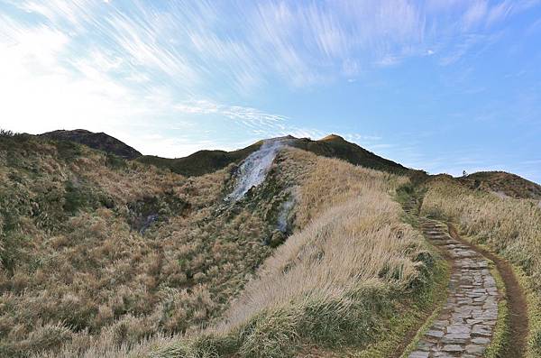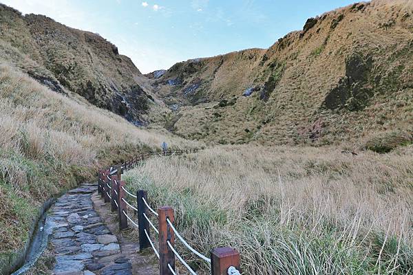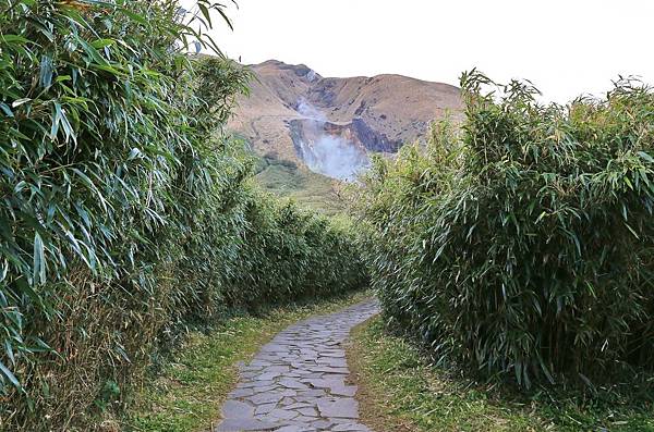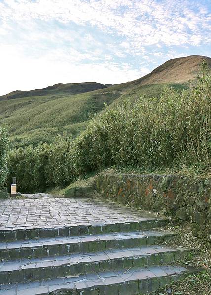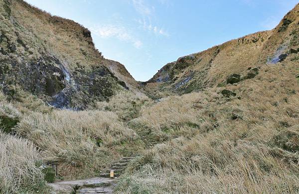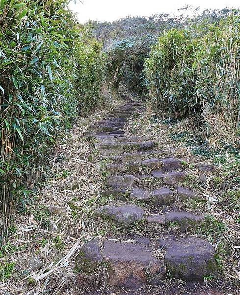 就這樣一路蜿蜒向上,仍然是石階步道,但石塊較凹凸,須注意被絆倒。此處右手邊就是剛剛在小油坑遊憩區看到的大窟窿!植被除了原有的箭竹外,還多了一整片的芒草。