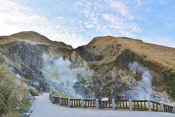 再往前進沒有多遠,就會看到陣陣濃煙以及濃濃的硫磺味撲鼻而來!小油坑遊憩區就在前方,煙就是從正前方的大窟窿冒出,大窟窿上可以清楚看到一條較暗灰色的區域,這個就是等等會經過的登山步道!