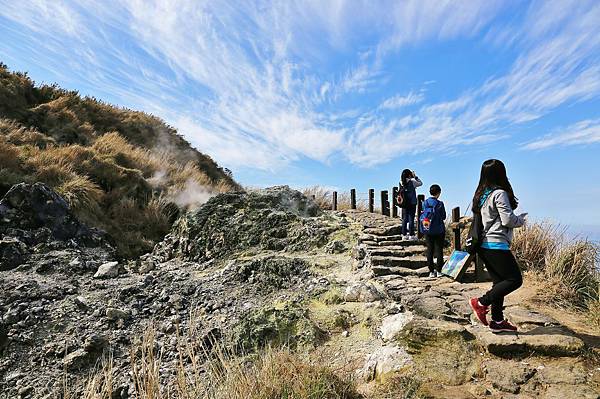 七星山登山步道一景,右下方就是大窟窿就是大量噴氣孔和硫氣孔的聚集處,經過此路段時,都可見陣陣白煙,有時還帶有刺鼻的硫磺味。