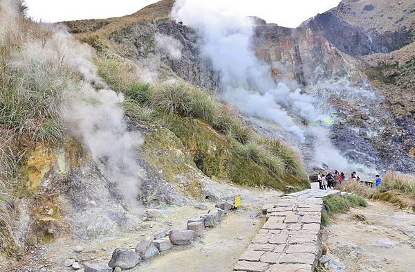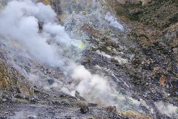 小油坑遊憩區一景,最具特色的地方就是前方的大崩壁地形,站在遠處就可看到陣陣白煙,偶爾還會漂來濃濃的硫磺味。崩壁上設有通往七星山主峰與東峰的步道,時間充裕的話,一定一定要攀爬而上,享受這裡獨特的大自然美景。