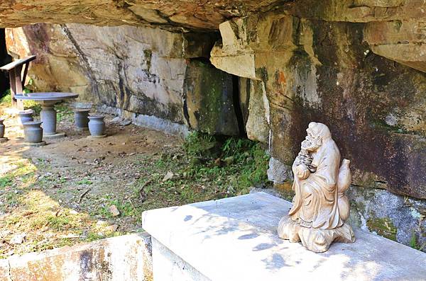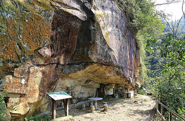 秀峰瀑布步道一景,岩壁下有石桌、石椅可供遊客乘涼休息。