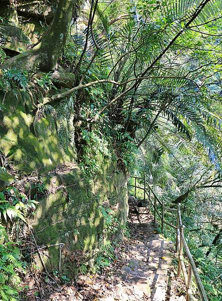 秀峰瀑布步道一景,部分山壁上還有山泉水留下,因此路面較濕滑,行走時需特別注意。