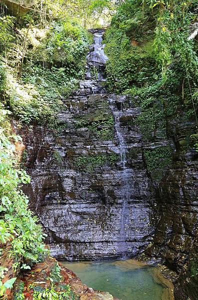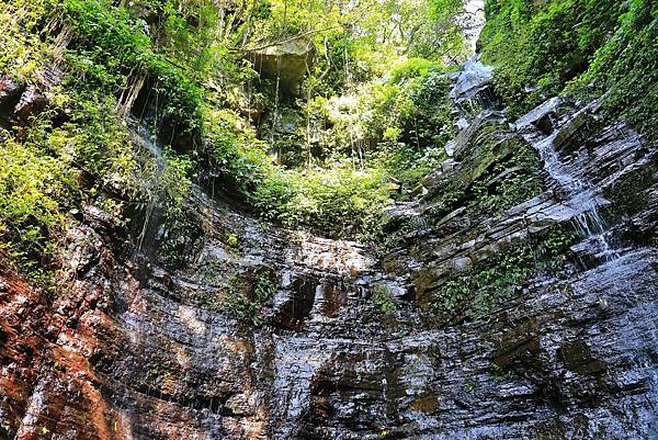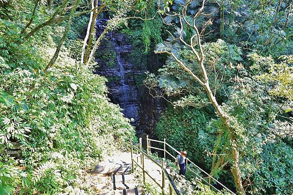 到達秀峰瀑布!正前方就是高達30公尺的瀑布岩壁,可以直行擇左下去直達瀑布底,或是往右下行有個小平台可供遊憩~