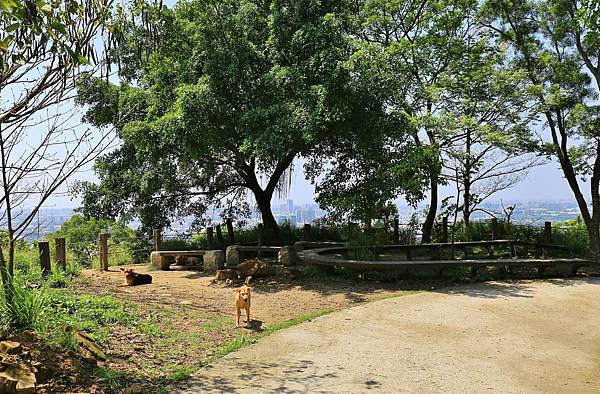 轉角處有一處樹蔭,彷彿是天然的涼亭,從這裡就可以遠眺大社市區與仁武一帶。此時剛好有許多狗狗在這乘涼睡覺。