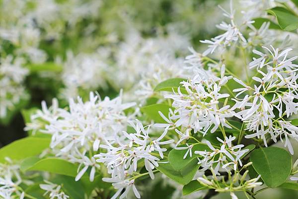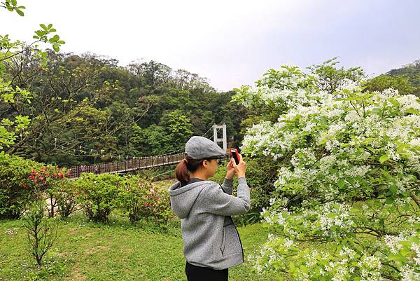 不論是開車還是騎機車前往十分瀑布,都須將車子停在遊客服務中心對面的停車場,再步行進入。繞過遊客服務中心後,發現路旁有一株流蘇花樹,現在正盛開呢!