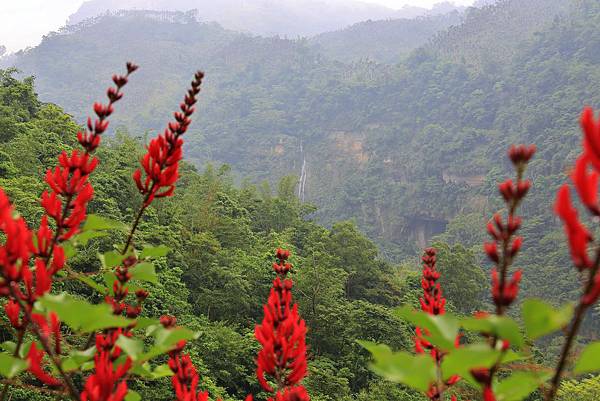 回程一景,遠方山壁上即為飛雲瀑布,四周的紅花為火炬刺桐!此景後方就是張瑞騰老先生所開設的愛玉冰店,美食當前,吃完都忘了拍照!有來此地旅遊,務必要來點一碗愛玉冰,作為給張老先生的支持!