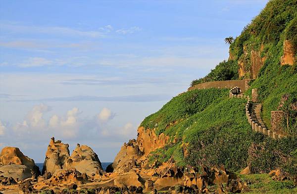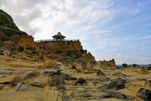 和平島公園一景,涼亭下方的怪石區就是萬人堆。此時懸崖上的野百合也正盛開著!