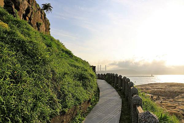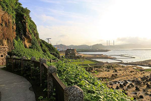 和平島公園步道一景,繞了一圈,下去就回到入口處了!遠方的三跟煙囪就是協和火力發電廠。發電廠旁的白米甕砲台景色絕佳,非常推薦去走走喔!