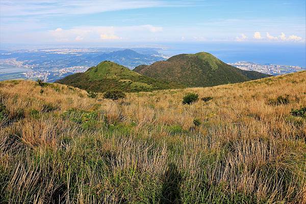 攝於大屯山車道,視野極佳,中間的小山頭是大屯山南峰、大屯山西峰。遠方則是八里的觀音山。