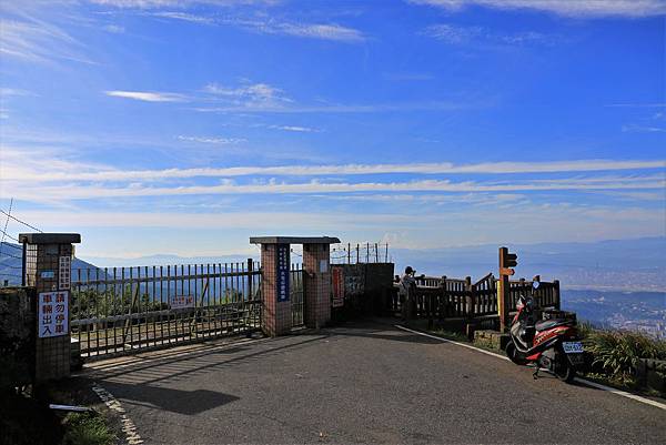大屯山主峰峰頂的助航台與一旁的觀景台,前往大屯山南峰與西峰的登山口就位於機車的正前方。