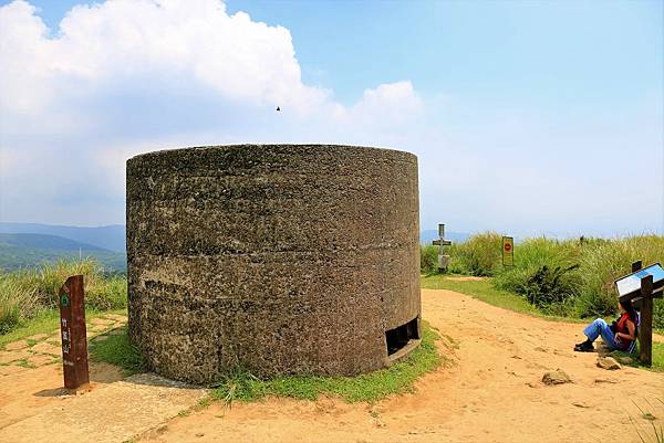 登頂!竹篙山山頂也有一座碉堡,編號1號。碉堡上原本有顆北市都市計畫處四等三角點編號235號,現已遺失。原本的土地調查局圖根點也已遺失,只剩下陽明山農場堺柱。