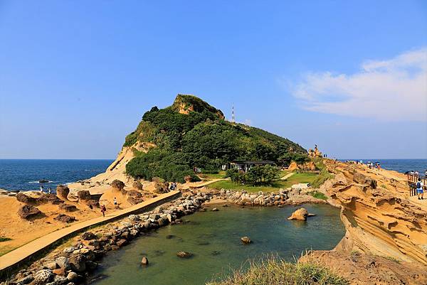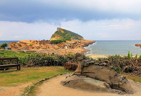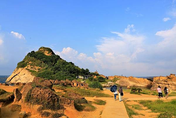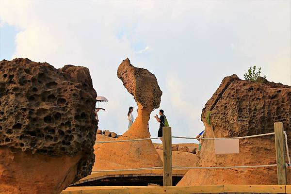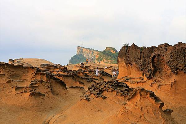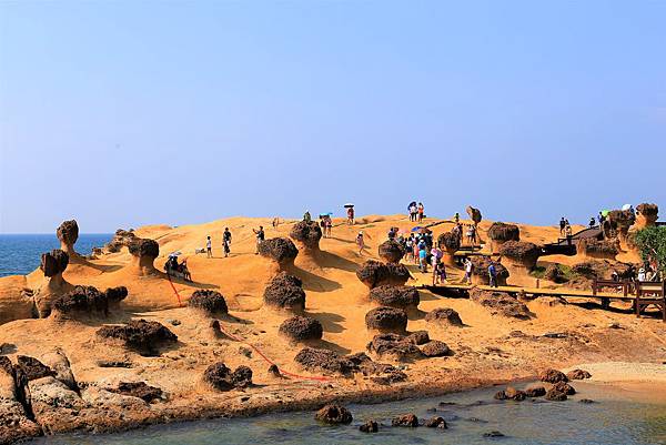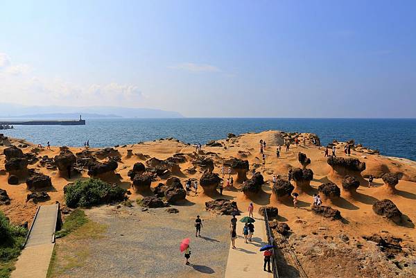 遠眺女王頭,脖子最細的那尊就是了!好幾年前來野柳,還可以自由靠近女王頭拍照,現在已用小石頭圍起一個範圍,禁止進入!