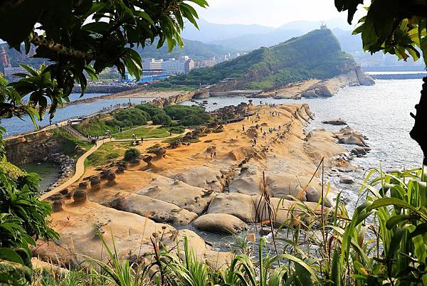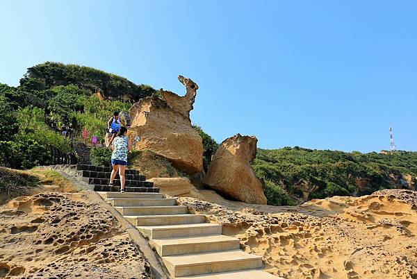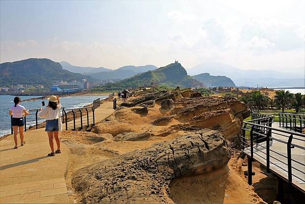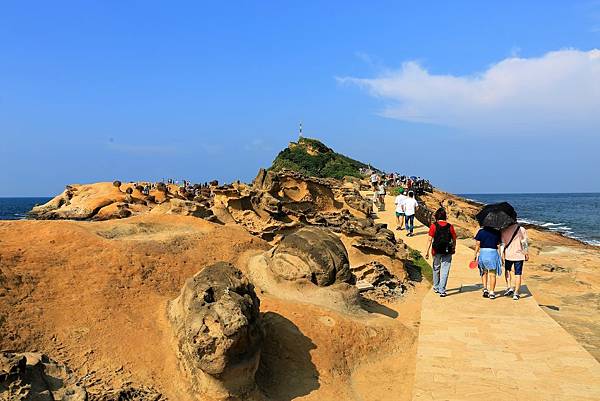 回首來時路,此處多為單面山的地形。眼前就是很經典的薑石,薑石為沉積岩中所沉積的堅硬岩塊,表面有幾道縱橫交錯的裂縫。出露地表後,經海水長期侵蝕,留下的部分顯得更加粗糙,看起來和老薑十分相似,故稱之為薑石。薑石景觀成帶狀分布,厚度約50公分,主要分布於燭台石與蕈狀岩間。先從右邊的步道下去看看女王頭!