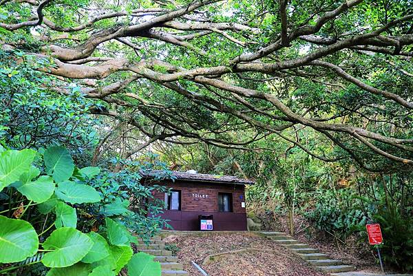 經過反射板與野柳燈桿,繼續往前行。居然在這裡藏有一座公廁,公廁旁的大樹也很奇特的往橫向生長,樹幹遮蔽了大片天空。