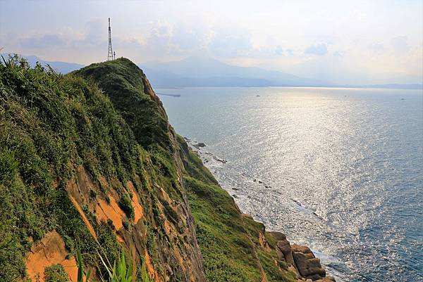 相當細長的野柳岬角,遠方則是野柳岬角上的單面山。單面山是指一翼坡度陡急、一翼緩傾的山形,是因為岩層被不等量擠壓抬升所形成的一種構造地形。野柳燈桿位於此單面山上。