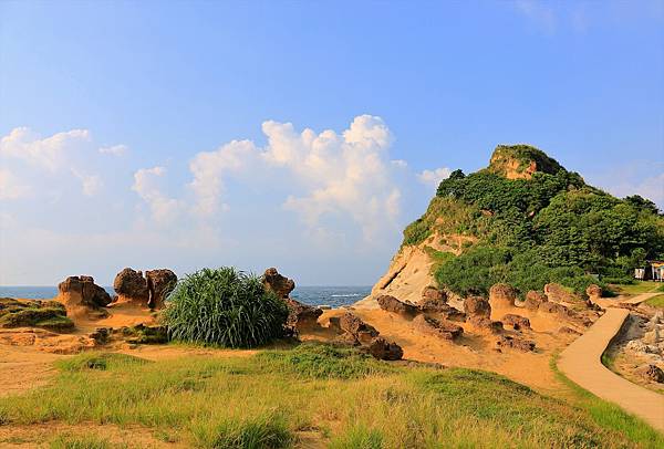此區還是由許多蕈狀岩組成,遠方的林投樹結實累累,不知道有沒有人偷摘下來吃!?