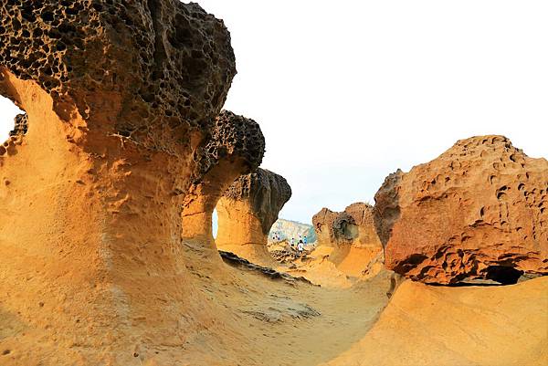 野柳著名的蕈狀岩(Mushroom rocks)地形,主要是因上下岩性的不同,上層抗侵蝕力較強,下層相對較弱而形成上粗下細的外型,酷似蕈狀而得名。在野柳地區的蕈狀岩依外型又可分為,無頸、粗頸、細頸、斷頸等四類。說明了蕈狀岩一生的生長演育過程。而這些蕈狀岩頭部幾乎都佈滿大小不一的坑洞,是因為這一層岩石含鈣質或生物的碎屑較多,且常有結核。當這些岩層受到海浪沖擊或被雨水溶解後,就會出現小洞。