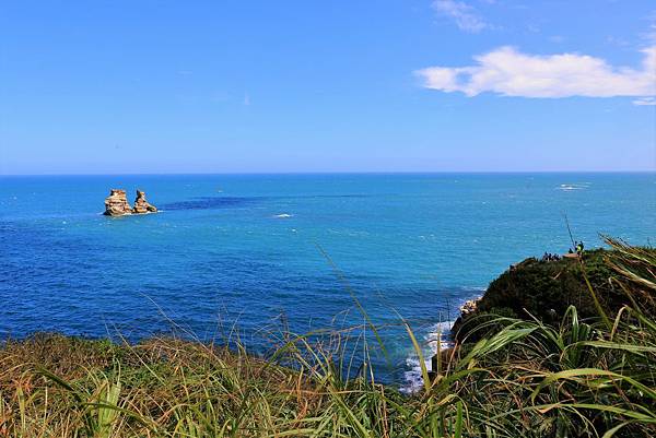 續往前行,登稜!!主角登場,燭台雙嶼。燭台雙嶼又名夫妻石,屺立於金山岬東側約450公尺的海面上,高約60公尺,岩基相連,出水後岐分為雙嶼,外型像一對蠟燭台相對峙,故名燭台雙嶼。燭台雙嶼之形成乃因地盤上升,由隆起的礁岩所形成之岩柱經過長時間的海浪侵蝕,獨留下堅硬的部分孤立於海中,形成典型的海蝕柱。