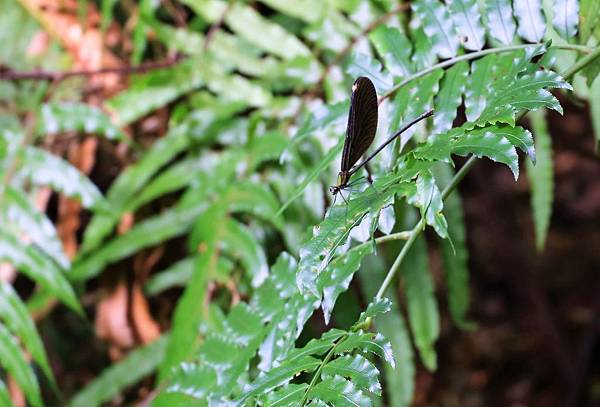 黑鳳蝶,Papilio protenor, 屬鳳蝶科,展翅 75 - 86mm,雄蝶翅膀黑色,無尾狀突起,後翅面前緣有具一條白色橫帶,翅緣波浪狀,翅腹面肛角及前緣有紅色弦月斑紋,有些個體紅斑不明顯或無,雌蝶近似雄蝶但雌蝶顏色較淡,後翅前緣無白色橫帶斑,翅緣較寬圓。本屬21種,普遍分布於低海拔山區,幼蟲以芸香科的柑橘及雙面刺等植物寄主。