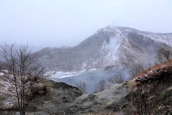 因為想看雪、想要體驗雪中開車的滋味,加上不想被大眾運輸的時間綁死,這次選擇以自助+自駕來暢遊北海道!登別地獄谷的停車場離園區入口約100公尺,停車相當方便。下了車,就有硫磺味撲鼻而來,停車場處就可以看到遠方的地獄谷地形。
