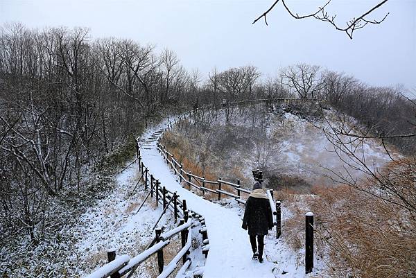 接下來進入登別原始林,都是林間小路,積雪甚厚。如果鞋子的抓地力不佳,在某些上坡處會走得相當吃力,大概就是爬一步但往後滑兩步的感覺。