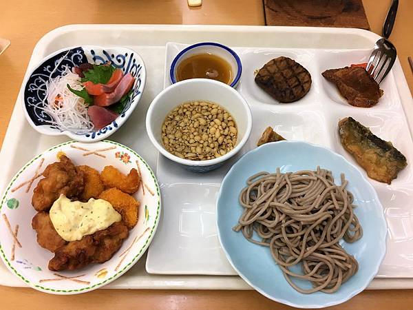 先來第一盤,這只是其中的一小小部分。生魚片只要你吃得完,基本上就是吃到飽的概念。蕎麥麵、唐揚雞塊,還有一些醃漬物都是必備的,還有日式咖哩、炸物、煎牛小排、水果、沙拉、甜點、午後紅茶等!