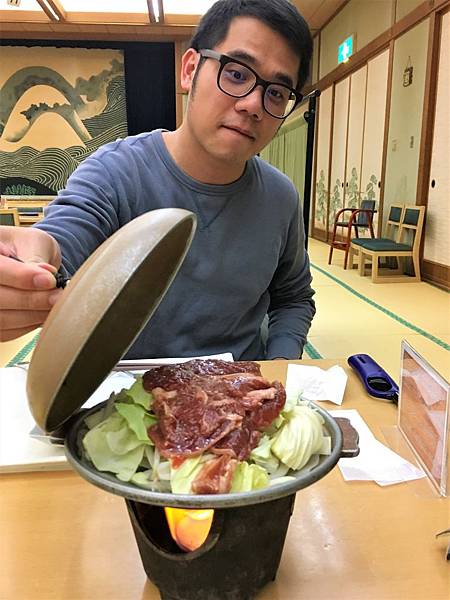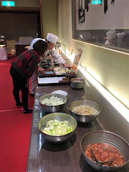 所有的食材都放在這區。照片中的老先生是飯店內的廚師,加藤利政先生,相當熱情好客,即便語言不通,還是可以這樣比手畫腳下介紹釜飯和成吉思汗羊肉鍋!