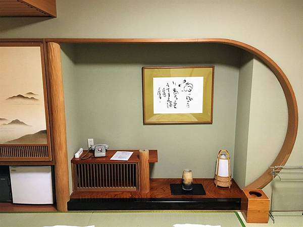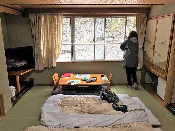 房間內的暖氣也是必備的,但到後來我們都吹到流汗,還偷偷開了窗戶納涼一下。房間內還備有冰箱、保險櫃、熱水器,左邊的衣櫥內備有浴衣,在石水亭,是可以允許房客穿著浴衣外出到飯店內各處的喔!