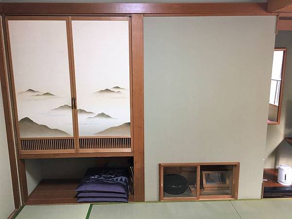 房間另一角,棉被就是收在左邊的櫥櫃內,感覺就是哆啦a夢 (小叮噹) 睡覺的地方!特別的是,石水亭還備有針線包,可能是怕房客的衣服破掉還是掉扣子吧。整體來說,和室房較為老舊,但還算乾淨整潔。