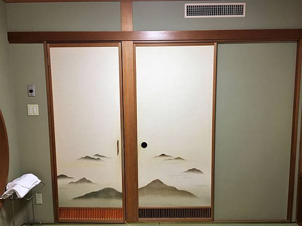 房間其實不大,而且又位在山壁邊的低樓層,所以看不到任何景色。照片有兩扇門,左邊是洗手台與浴室,因為相當狹窄,又有鏡子,為了不讓蓬頭垢面的我們入境,浴室就沒另外放圖了,基本的吹風機、洗髮乳、沐浴乳、牙刷、牙膏、毛巾等盥洗用具等都有提供。右邊的門是玄關,廁所設在玄關的另一側,因為位子實在太狹窄,抓不到好角度,這部分也沒放圖,廁所內的免治馬桶是一定有的,只是...廁所沒有洗手的地方,所以上完廁所要先進房間,再開啟左邊的門洗手...