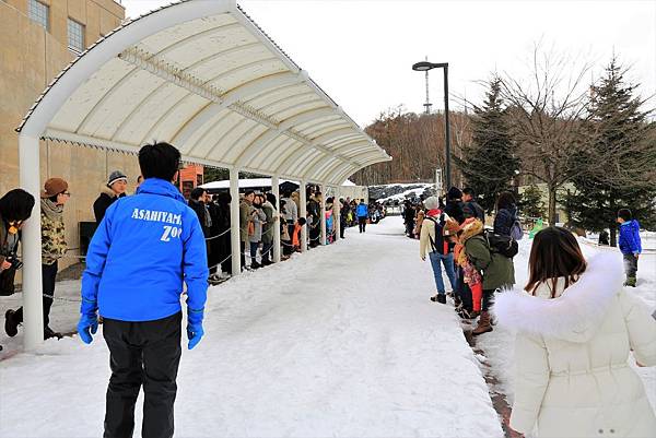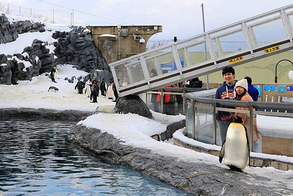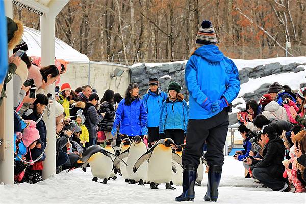 企鵝散步開始啦!每天會有兩場,第一場11:00開始、第二場則是下午2:30。建議一早入園後,先在企鵝館附近逛,約提早20-30分前去卡位!當時園區地上都還積雪結冰,園方還很貼心清出一條"壕溝"方便人們站立。