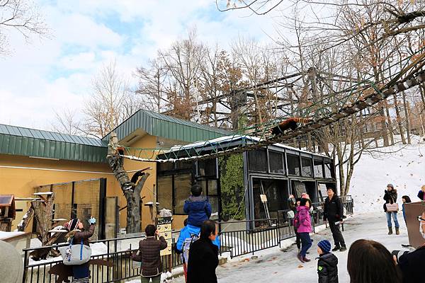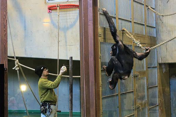 旭山動物園所飼養的靈長類主要有紅毛猩猩、黑猩猩和長臂猿等,這些猿猴的展示空間都設有如照片中的遊憩區可供攀爬,連人類看了都想進去爬爬看!可惜冬季靈長類都飼養在室內展示區。