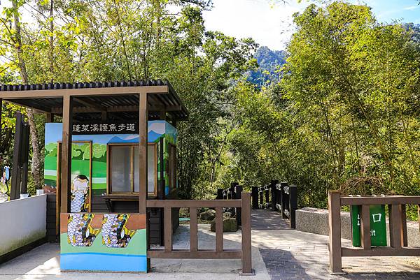 蓬萊溪護魚步道入口。步道全長約1.6公里,另一端在七星宮,可選擇原路折返或走124縣道返回。