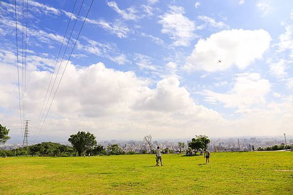 草地上放風箏的遊客。因為高壓電塔就在旁邊,其實不建議在這裡放風箏喔!
