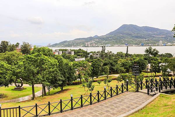 在通往砲台的上坡,有一小段路視野還不錯,可以遠眺淡水河景和對岸的八里觀音山,下方則是一滴水紀念公園。