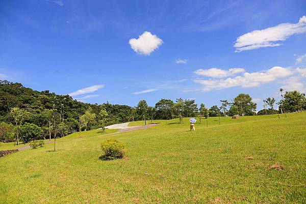 發現遠上有座大溜滑梯,往草坡上走去。如果天候涼爽,這座小草原非常適合來野餐~